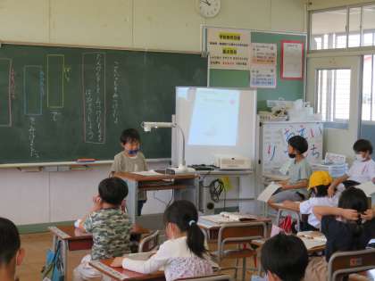 今日は、国語科「こんなものみつけたよ」の学習で、書画カメラでワークシートを映しながら、見付けた場所、見付けたもの、思ったことを発表しました。
