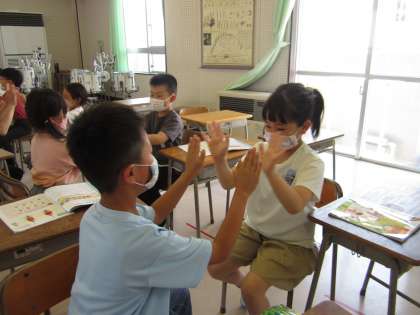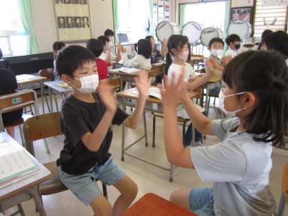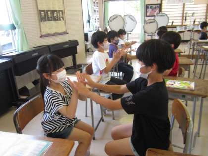 音楽科では、2拍子や3拍子を、歌に合わせて手遊びをしながら学んでいます。楽しみながら、拍を感じることができるようになるといいなと思います。学習の後は、しっかり手洗いをしました!