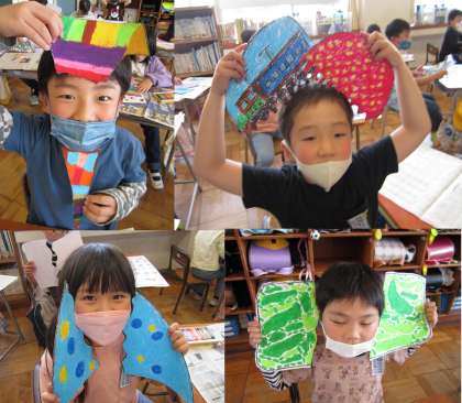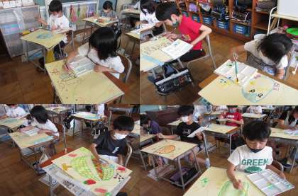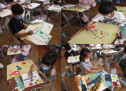 先日描いた「ふしぎなたまご」を割り(ハサミで切り)、中から出てきたものを想像して描きました。水彩セットを使い、色を丁寧に塗りました。一人一人の楽しいアイディアが溢れる、素敵な作品が完成しそうです!