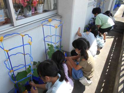 朝は、野菜の水やりから始まります。「あっ、花が咲いた!」「少し背が高くなってる!」とワクワクしながら、水やりをしています。