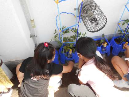 わき芽をとったり、支柱を立てたりと、本や図鑑を見ながら、一生懸命に野菜を育てています。