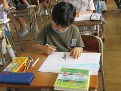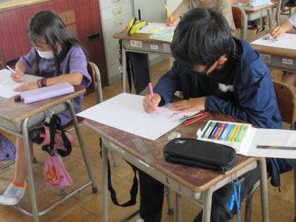 図画工作科の時間に、「未来の富山市はどんなまちがよいか」、一人一人が想像し、自由に絵に表す活動をしました。子供たちは、「今は見たことがない生き物も見ることができる、自然や生き物にあふれた富山市になってほしい」「たくさんの祭りやイベントがある楽しい富山市になってほしい」など、子供たちが自分の夢や希望を思い思いに描いていました。
