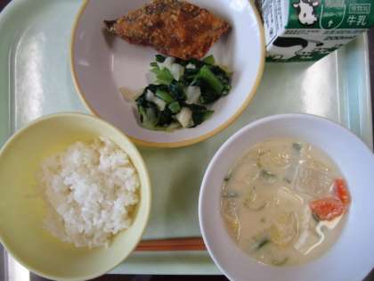 今日の献立は、ご飯、魚の竜田揚げ、小松菜ひたし、呉汁、牛乳です。