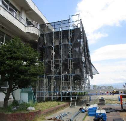 グラウンドにアスファルトが敷かれ、校舎には足場が組まれました。本格的に工事が始まります。少々不便ではありますが、安全に気を付けて、外で遊んだり、体育の授業をしたりしていきます。