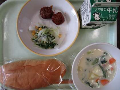 今日の献立は、コッペパン、ミートボール、水菜のサラダ、ほたてのクリーム煮、牛乳 です。