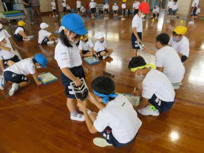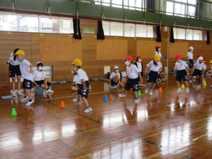 スポーツテストの「反復横跳び」「上体起こし」「握力」に取り組みました。1年生だけでは数を数えるのが難しいので、6年生に協力してもらいました。反復横跳びでは、見本を見せてもらったり一緒に練習したり、マンツーマンで教えてもらいました。優しい6年生さんと一緒に運動できて、嬉しそうでした。