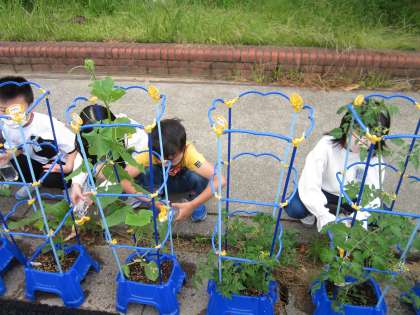 野菜はどんどん大きくなってきました。最近は、アブラムシやうどんこ病との戦いが続いています。お日様の光を浴びて、美味しい野菜が収穫できますように!