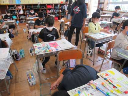 子供たちは、「輝いている所をスパッタリングで表したい」「ビー玉で花の茎を表したい」など、自分の思いをどのような技法で表現するかを考えて取り組んでいました。