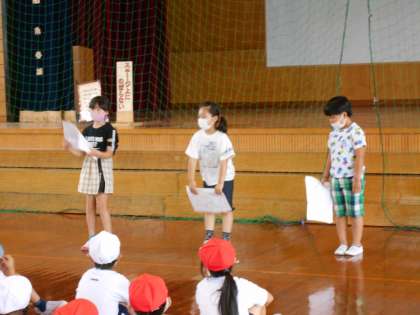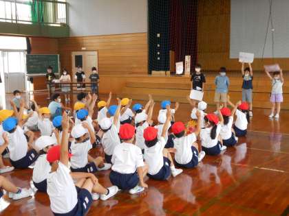 2年生:「なかよし集会1」:6月10日(金) 公開日 2022/06/13 更新日 2022/06/13 2年生の部屋 今日は、1年生を招待して、なかよし集会を行いました。 この集会のために、1年生が楽しめるようなクイズを考えたり、セリフを何度も練習したりと、一生懸命練習してきた子供たち。「緊張したけど、楽しかった!」「1年生が楽しんでくれて、うれしかった!」と、集会を楽しむことができたようです。また、1年生と一緒に楽しく活動できたら、いいですね。
