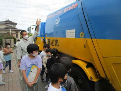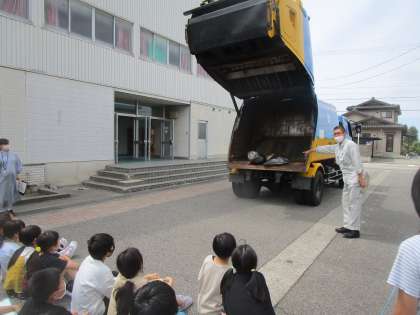 3Rスクールの後半では、パッカー車(ごみ収集車)を見せていただきました。パッカー車の仕組みについて詳しく知ることができました。