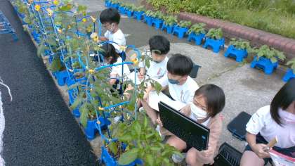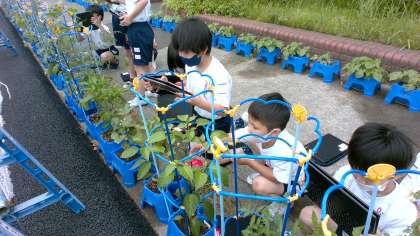 「大きさ」「形」「色」「におい」「さわったかんじ」・・・などなど、観察するポイントを確かめた後、野菜を観に行って、メモを取ったり、クロームブックで撮影したりしました。算数科で学習したばかりの「長さ」を竹ものさしを使って測っている子供もいました。