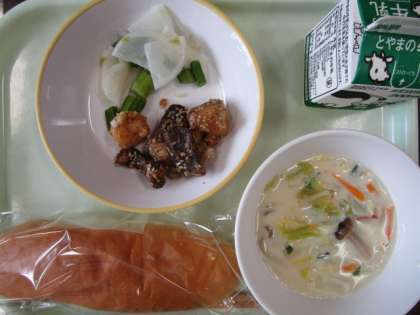 今日の献立は、米粉コッペパン、魚とレバーのエゴマだれからめ、カブのサラダ、中華スープ、牛乳 です。
