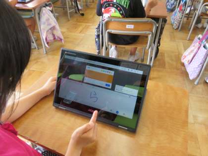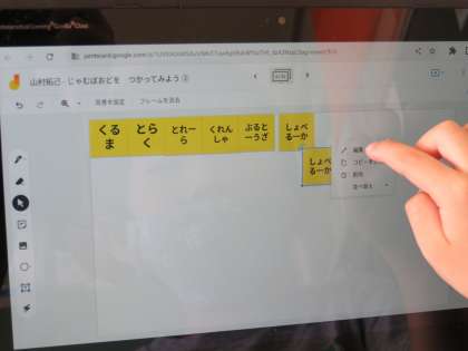 1年生:クロームブックで 公開日 2022/06/16 更新日 2022/06/16 1年生の部屋 ジャムボードアプリを使って「付箋ゲーム」をしています。指定された文字を入力し、貼り付けています。文字は、手書き文字入力をしていますが、丁寧に書かないと認識してくれません。 ゲームをクリアした子供は、しりとりで付箋をつないだり、付箋を大きくしたり、いろいろと試しながら使い方をマスターしていました。 今後のジャムボードアプリでの学習に生かしていきます。