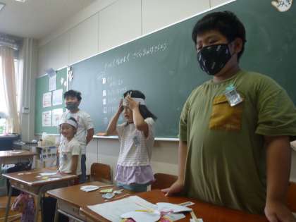 3年生の理科の学習でモンシロチョウを教室で育てた経験から、チョウへの愛情を深めた子供たち。チョウが登場する話を作りました。台詞はみんなで考え、ペープサートや小道具を作りました。