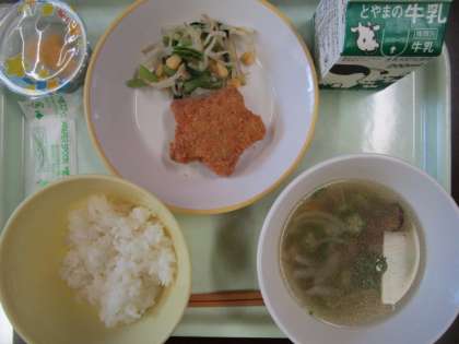 ご飯、星形メンチカツ、コーン和え、天の川スープ、七夕デザート、牛乳 です。