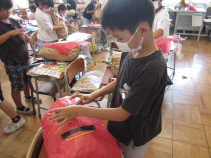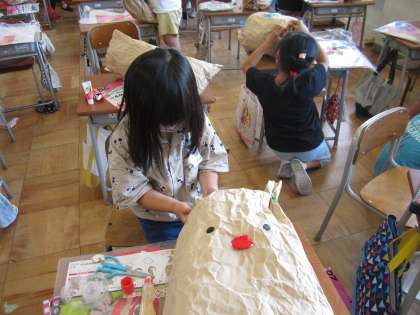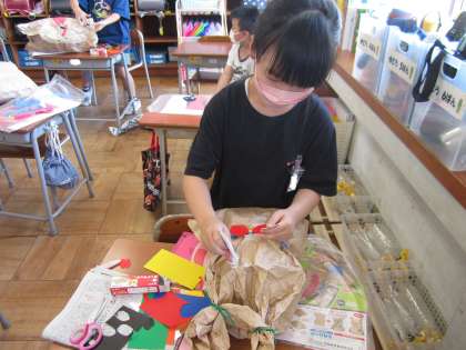 「しんぶんしと なかよし」の学習で、紙を「ねじる」「丸める」「破る」「折る」など、たくさんの工夫の仕方を学びました。今日はそれを生かして、茶色の紙袋を○○に変身させました。袋の中に丸めた新聞紙を詰めて、抱き枕のように「ぎゅっ」としながら作品作りをすすめました。ひもやモールで縛る場所を変えたり、紙で飾り付けたりして、作品をパワーアップさせていきます。