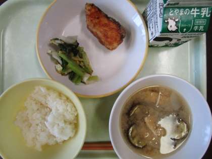 今日の献立は、ご飯、揚げ魚のレモン味、とろろ昆布和え、なすのみそ汁、牛乳 です。