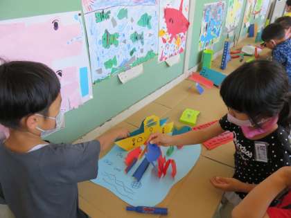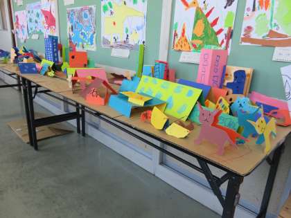 建物、乗り物、動物、自然・・・思い思いに作品を作りました。作ったものから展示スペースに作品を置き、池や道路、線路などを描き加えていました。すてきな「しあわせなまち」ができました。
