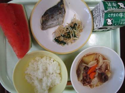 今日の献立は、ご飯、鰆の塩焼き、炒り大豆和え、肉じゃが、すいか、牛乳 です。