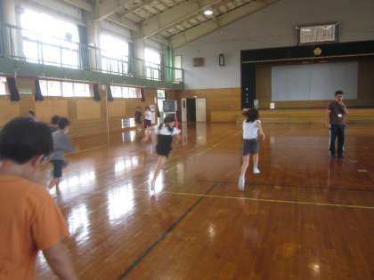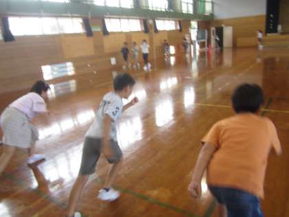 今日の「すこやか運動」は、体育館で走りました。先生と競争する子供たちも。