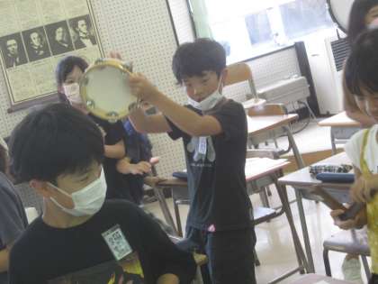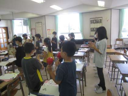 今日の音楽では、リズムに合わせてダンスをしたり、楽器を鳴らしたりして体全体で音楽に親しみました。