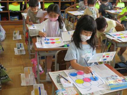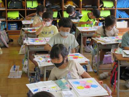 昨日は、道具の名前を覚え、準備の仕方を学習しました。今日は、いよいよキャンディーに色を塗ります。赤、青、黄の3色を使って、単色で塗ったり2色を混色して塗ったりしました。