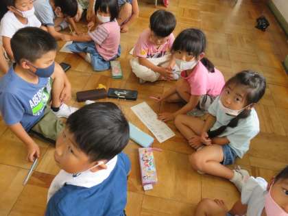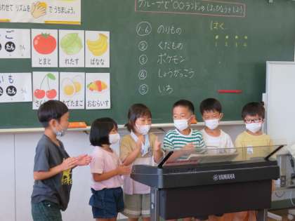 拍の流れにのりながら、3〜5文字の言葉を手拍子します。グループ毎にテーマを決めて言葉を集め、友達とつなげて音楽を作り出す学習です。グループでリズムのつなげ方を工夫しながら、みんなでノリノリで取り組みました。