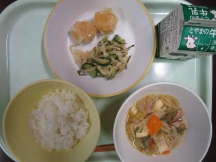 給食では、韓国風ということで、ごま油と唐辛子を最後に加えてあります。牛肉の代わりに豚肉を、また、玉ねぎ、にんじん、白菜、えのき、ねぎと、たくさんの野菜を使ってあります。