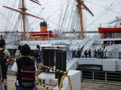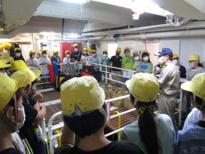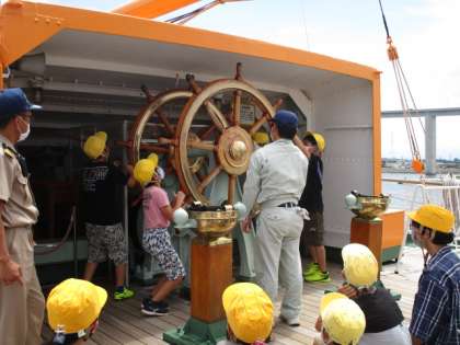 海王丸パークでは、「海王丸」の中で「海洋教室」に参加しました。ゼカンドオフィサーから、お話を聞いたり、船内の探検や展帆作業、舵輪回しなどに取り組んだりしました。