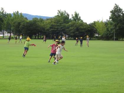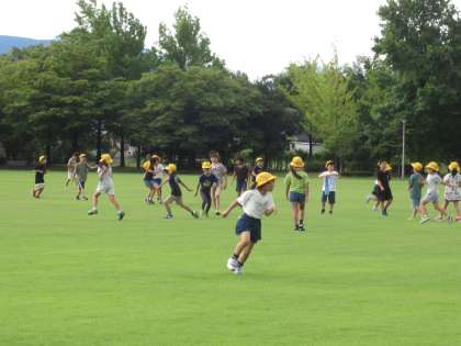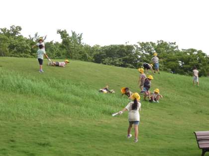 広いサッカー場やテニスコートの横を通り、きれいな芝生広場に着きました。班ごとに「すてき」を見付けた後は、自由時間ということで、鬼ごっこをしたり、芝生の山をごろごろと転がったりとして、のびのびと遊ぶことができました。