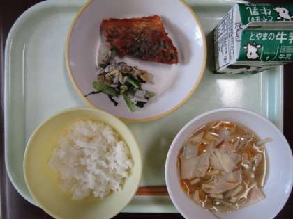 今日の献立は、ご飯、さばの竜田揚げ、梅肉和え、ワンタンスープ、牛乳 です。