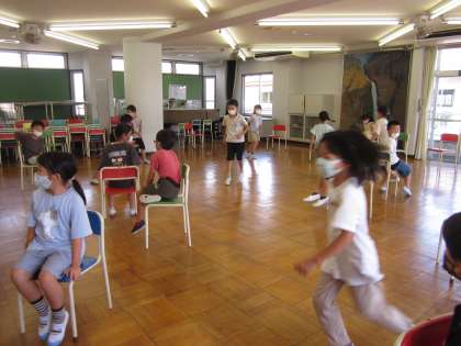 2学期の音楽は「ソーシャルディスタンス椅子取りゲーム」からスタート。ただの椅子取りゲームではなく、音楽が鳴っている間、音楽に合った動きをしながら移動します。椅子もバラバラに置かれているので、広くなったランチルームでのびのびと動くことができました。