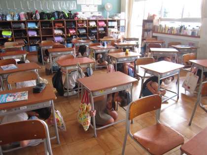2学期最初の避難訓練は、地震が起きた想定で行いました。机の下で身を低くする、静かに落ち着いて避難する、グラウンドで素早く整列することが上手になりました。