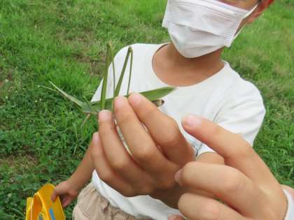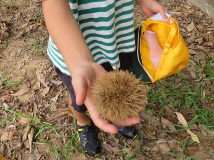 生活科の時間にグラウンドや新保の森で活動しました。グラウンドの草の生えているところには、ショウリョウバッタやトノサマバッタ、イナゴ、コオロギ等、たくさんの虫がいました。中には、体長10センチメートル以上もあるものもあり、大きさにびっくりです。新保の森には、クリやドングリ等の木の実がたくさんなっていました。