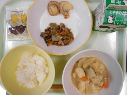 今日の献立は、ご飯、ほたての香味焼き、もずくのチャプチェ、ごまけんちん、黒糖大豆、牛乳 です。は、