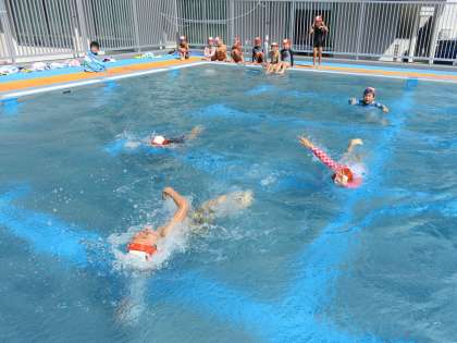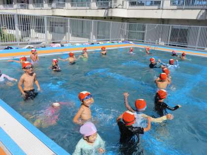 台風接近で強風の中でしたが、今年最後のプール学習で子供たちの笑顔がはじけていました。担任の近くに来て「もぐれるようになったよ」「バタ足するから、見てて」「クロールができるよ」等と、猛アピール!! できるようになって、自信がついてきました。
