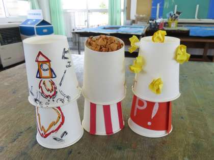 紙コップに輪ゴムをかけて、紙コップロケットを作りました。ゴムの力を利用した手作りおもちゃです。デザインもロケットだけでなく、うさぎや花火、ポップコーン等、アイディア満載です。真上に飛ばすだけではなく、水平方向に飛ばしたり2個重ねて飛ばしたり、遊びながら進化させていました。
