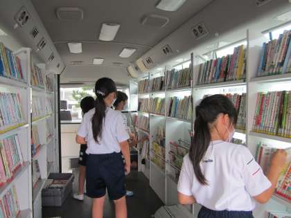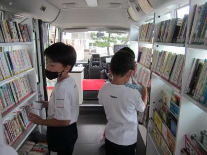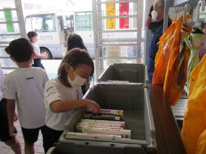 そろそろ読書の秋ですね。今日は月に1回の自動車文庫の日です。学校の図書室にない本もたくさんあるので、子供たちはじっくり本を選んでいました。