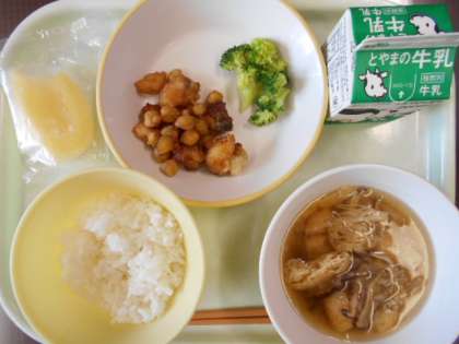 今日の献立は、ご飯、魚とひよこ豆の甘からめ、ゆでブロッコリー、沢煮椀、冷凍りんご、牛乳 です。