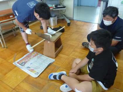 用具は、ペットボトルや棒を使い、自分たちでつくりました。