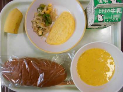 今日の献立は、黒糖コッペパン、オムレツ、アスパラサラダ、かぼちゃのポタージュ、バナナ、牛乳 です。