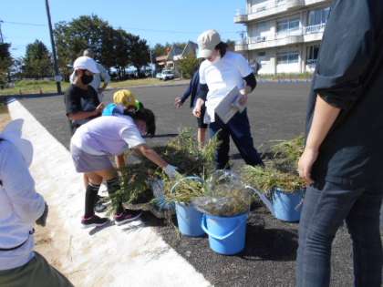 新保っ子タイムには、延期していた「色団対抗草むしり合戦」があり、みんなでグラウンドの草をたくさんむしりました。どの団が勝利したか。結果発表が楽しみですね。