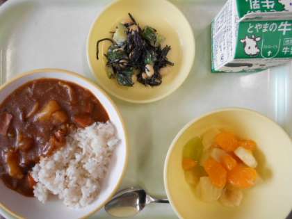 今日の献立は、食べキリンハヤシ(麦ごはん)、大豆とひじきのサラダ、フルーツミックス、牛乳 です。