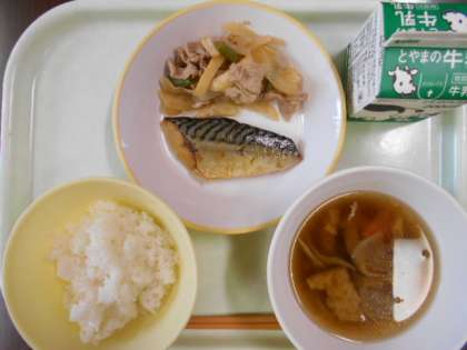 今日の献立は、ご飯、さばの塩焼き、マコモダケの炒め物、きのこ汁、牛乳 です。