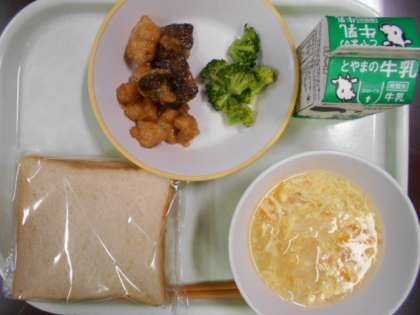 今日の献立は、食パン、鶏肉とレバーのマーマレードソースからめ、ゆでブロッコリー、コーンと卵のスープ、牛乳 です。