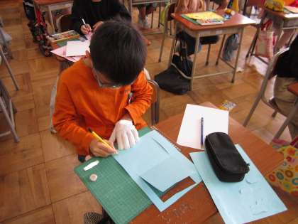 初めてのカッターナイフにドキドキしていた子供たちも、だんだん慣れてきました。本番の作品作りの前に、画用紙で窓を作る練習をしました。色々な形の窓ができました。次からいよいよ作品作りスタートです。