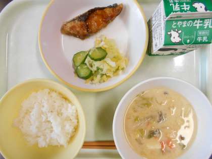 今日の献立は、ご飯、ふくらぎのごまだれがけ、あわせ和え、呉汁、牛乳 です。
