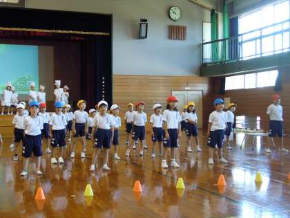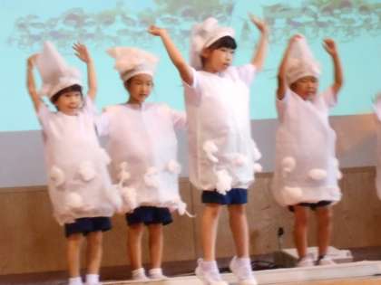 初めての学習発表会で、緊張気味の子供たちでした。くじらぐも世界を表現しようと、練習してきたことを出し切りました。「緊張したけど楽しかった」「最後の歌の時、涙が出そうになった」などと、感想を述べていました。
