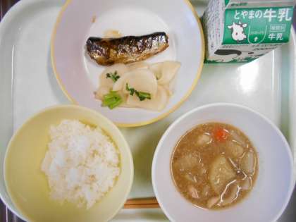 ご飯、いわしの生姜味、かぶの色どり、鶏肉と里芋のごま煮、牛乳
