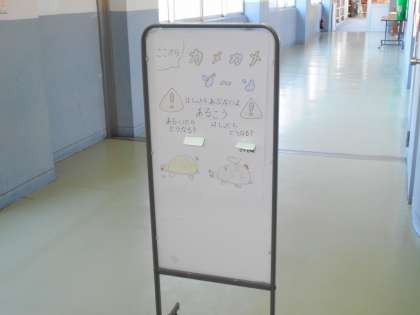 朝のあいさつ運動が続けられている中、今度は廊下に「カメカメゾーン」の看板が置かれ、休み時間には「もしもしかめよ〜」の歌が流れました。これらは運営委員会の子供たちが考えた「廊下を歩こう」運動の作戦です。この作戦で「廊下は歩く」意識が広まって、学校のみんなが安心して過ごせるようになるといいですね。